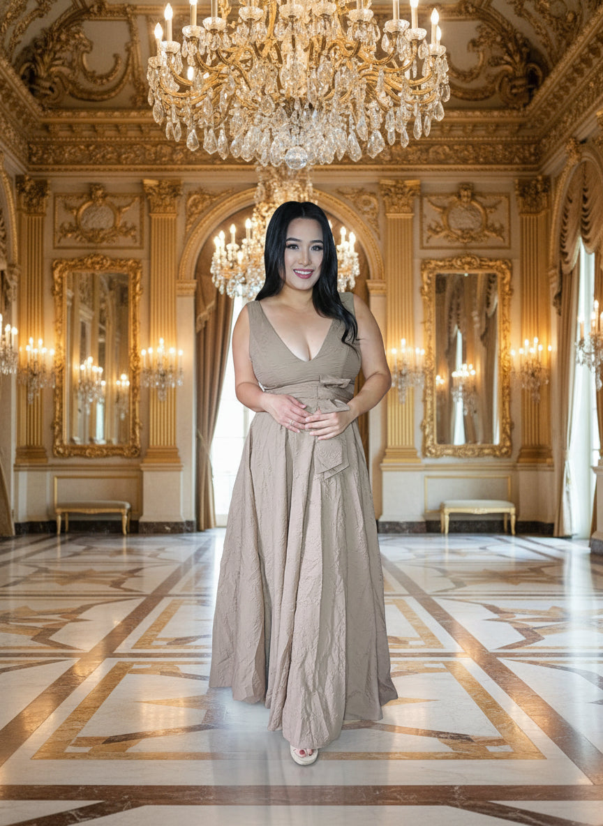 D750 - Premium V-Neck Waist Ribbon Flared Maxi Dress (MOCHA)